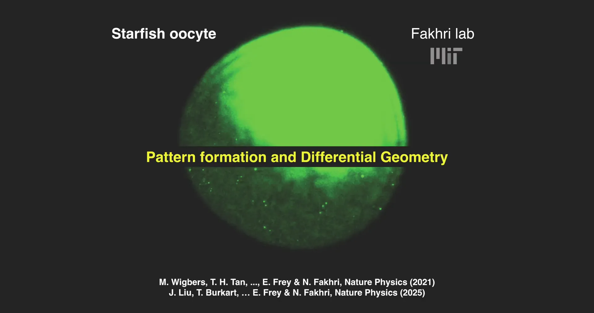 In the preceding minutes, he explained how the Min protein pattern in E. coli "senses" and "reads" the cell's geometry (i.e., the cylinder). This starfish oocyte slide shows a more advanced, complex coupling: