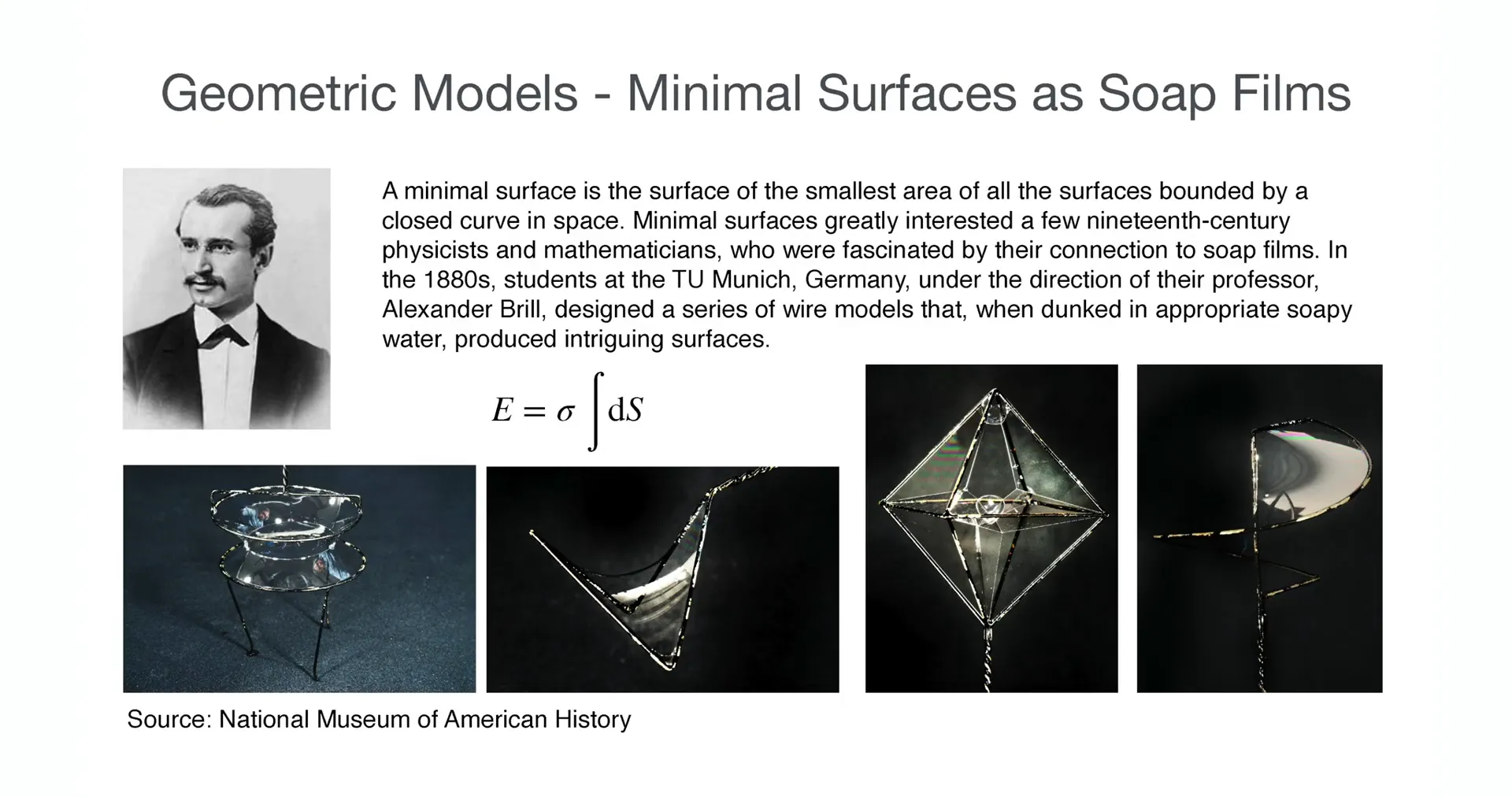 Geometric Models - Minimal Surfaces as Soap Films. The person in the upper left corner is Professor Alexander Brill. In the 1880s at the Technical University of Munich, he supervised students to design a series of wire frame models. These models were dipped into soapy water to generate interesting surface shapes, helping physicists and mathematicians of that era study minimal surfaces. \(E = \sigma \int \text{d}S\) reveals the physical mechanism by which soap films form minimal surfaces. \(E\) represents surface energy. \(\sigma\) (sigma) represents the surface tension coefficient. \(\int \text{d}S\) represents total surface area. For the system to reach the lowest energy stable state (minimize \(E\)), with constant surface tension, it must minimize the surface area (\(\int \text{d}S\)). The four photographs below show thin films formed when wire frame models of different geometric shapes are dipped in soap solution. The shapes these films automatically form are the minimal area surfaces under given boundaries (wire frames), i.e., minimal surfaces.