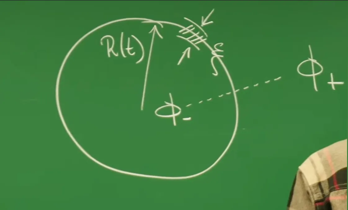 Assume that in an infinite steady-state background phase \(\phi_+\), there exists a spherical region of radius \(R(t)\), whose interior is in another steady-state phase \(\phi_-\). Physical intuition tells us that since the system always tends to minimize total free energy (i.e., minimize interface area), this droplet should spontaneously shrink. The goal of this section is to start from the microscopic Allen-Cahn equation and, through rigorous mathematical derivation, obtain dynamical equations describing the evolution of macroscopic radius \(R(t)\).