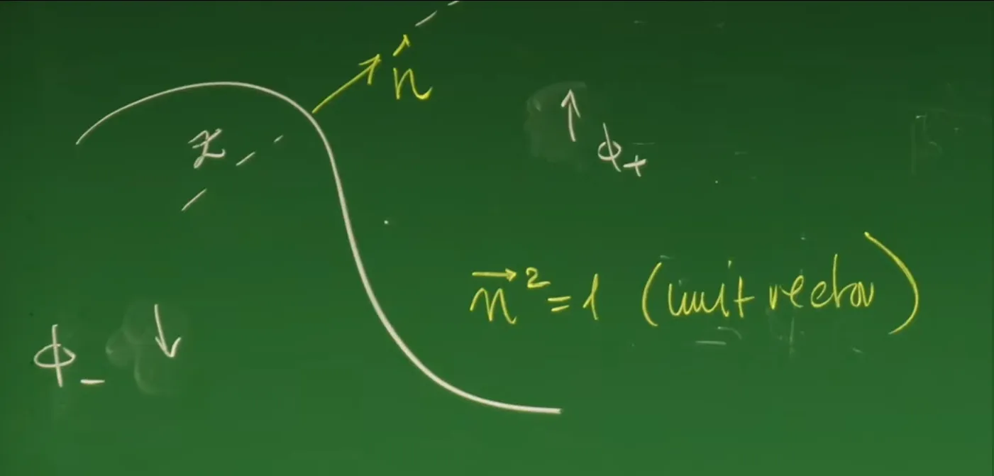 To find static interface solutions, impose the steady-state condition \(\partial_t \phi = 0\). Consider the simplest geometric configuration: an infinite system with a Flat Interface perpendicular to the \(x\)-axis, separating the \(\phi_-\) phase on the left from the \(\phi_+\) phase on the right. Due to translational symmetry, \(\phi\) depends only on spatial coordinate \(x\), and the partial differential equation simplifies to a second-order ordinary differential equation:
