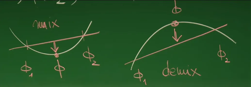 Physical conclusion: If the free energy density curve \(f(\phi)\) is globally convex (like a bowl), then no matter how mixing occurs, the homogeneous state is always the most stable, and the system will not undergo phase separation.
