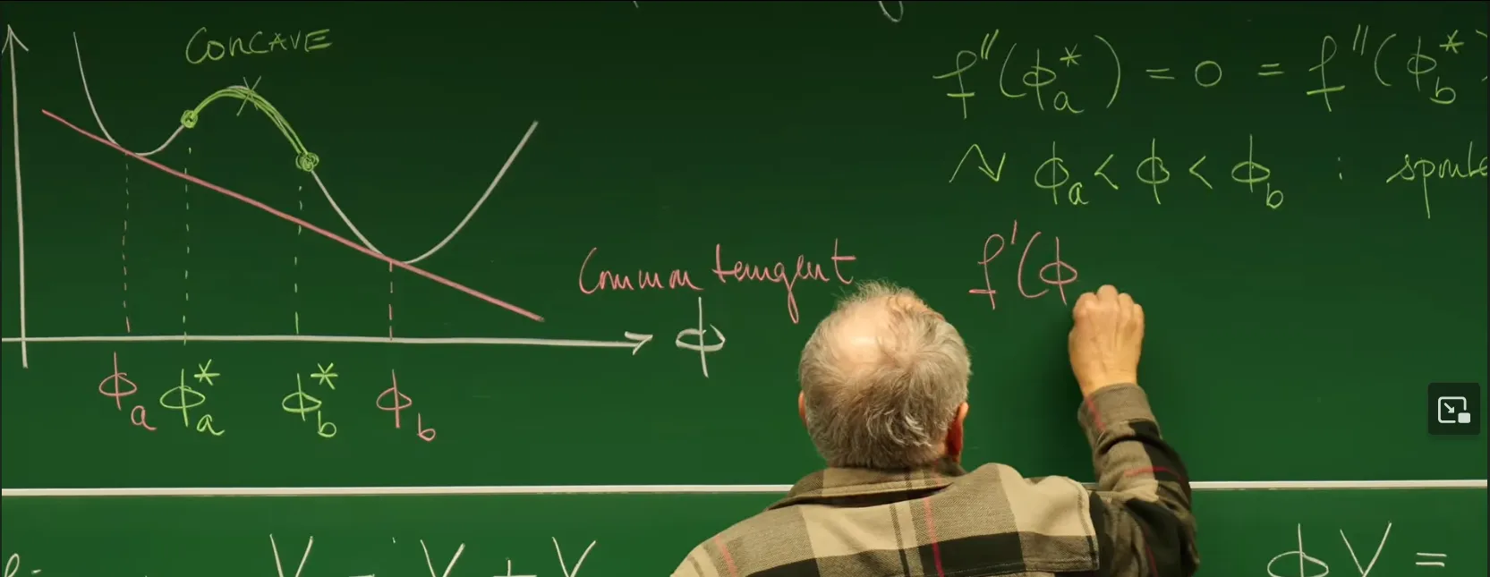 Geometrically, this corresponds to a certain point on the Chord connecting points \((\phi_1, f(\phi_1))\) and \((\phi_2, f(\phi_2))\) on the free energy density curve \(f(\phi)\).