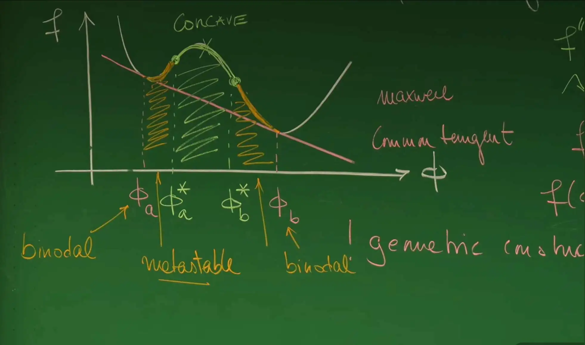 Locally Stable: \(\frac{\partial^2 f}{\partial \phi^2} > 0\). At this point the free energy curve is locally convex, small fluctuations will increase system energy, so fluctuations are suppressed, and the solution maintains metastable or stable state.