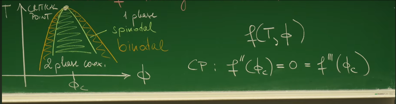 Locally Unstable: \(\frac{\partial^2 f}{\partial \phi^2} < 0\). At this point the free energy curve is locally concave, small fluctuations will cause system energy to decrease. This means any infinitesimal thermal noise will be spontaneously amplified, leading to rapid system destabilization.
