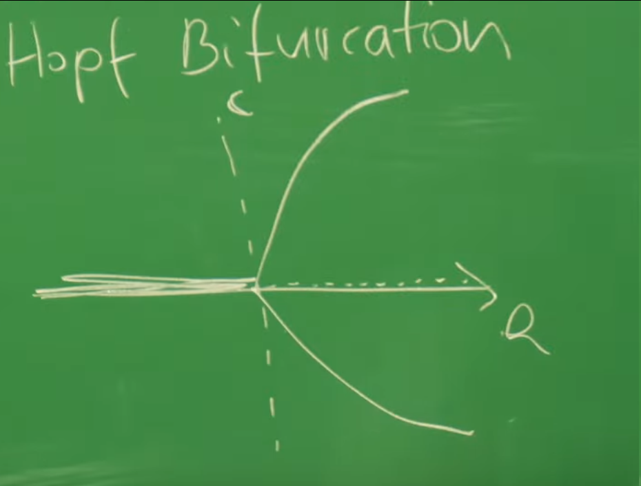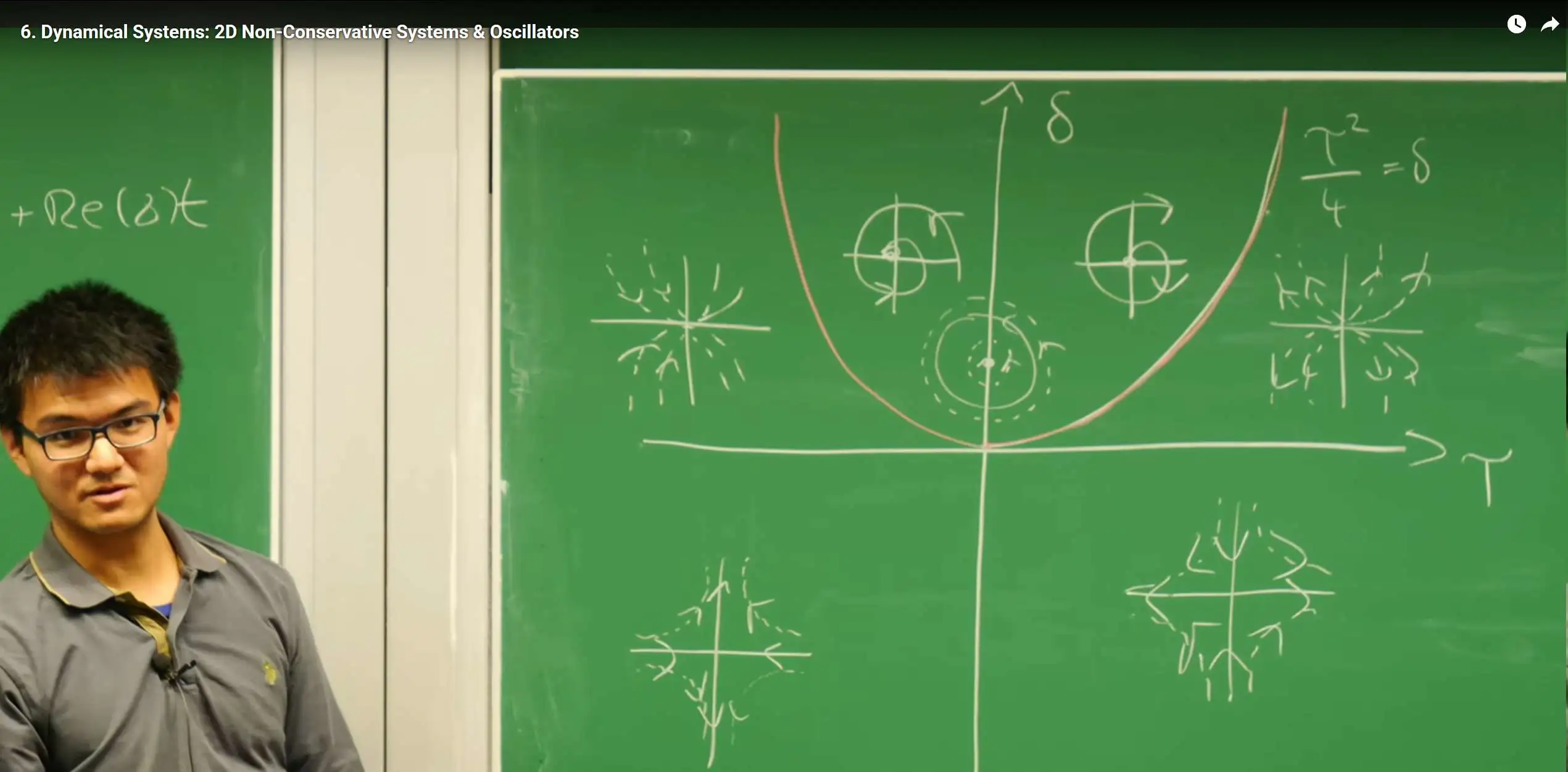 Mathematics: At least one eigenvalue is zero. This corresponds to the boundary of the parabola \(T^2 = 4\Delta\) (degenerate node) or the \(\Delta=0\) axis (saddle-node bifurcation, etc.). This is the situation encountered in Lecture 3 and Lecture 5, signaling that Bifurcation is about to occur.