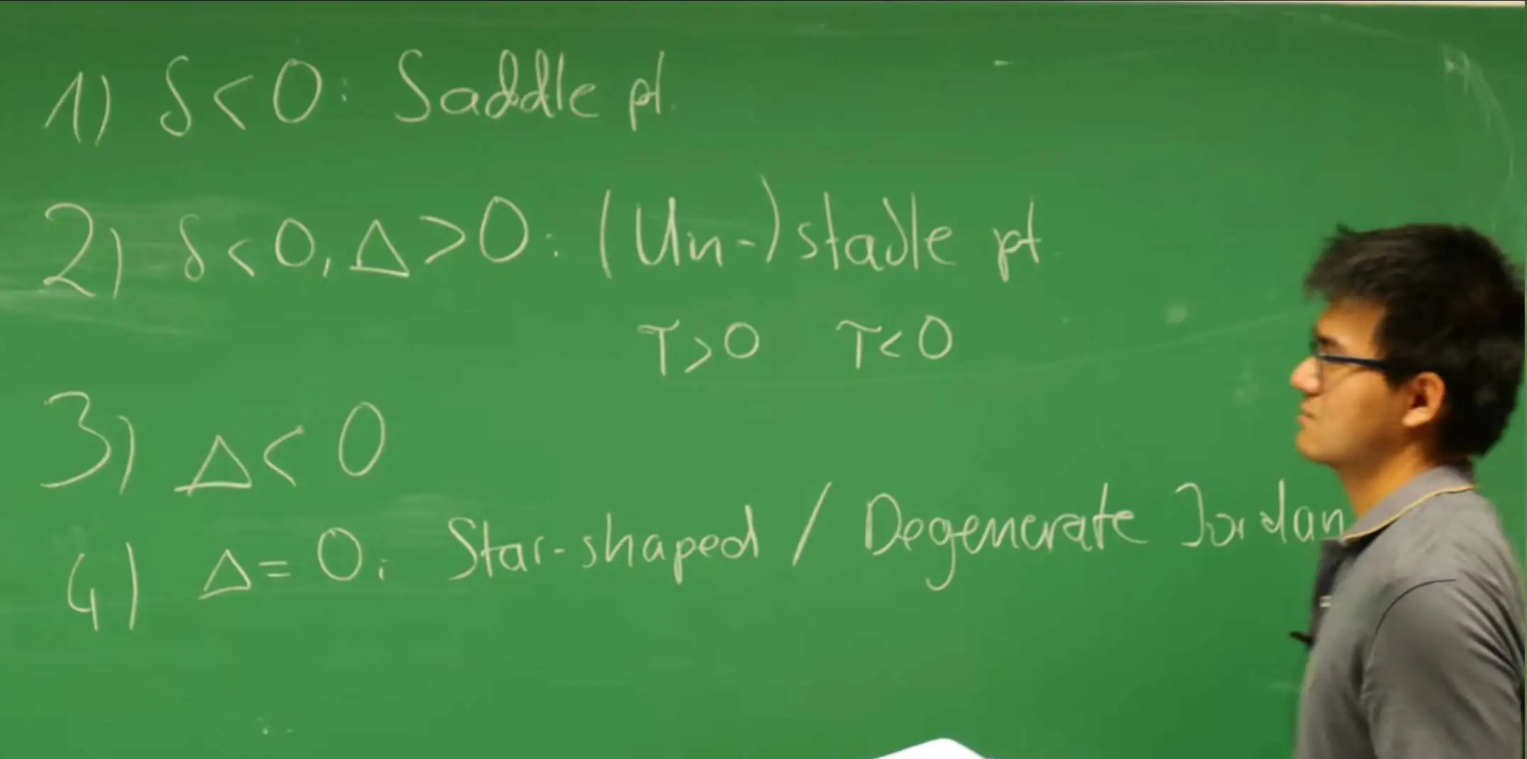 Mathematics: \(\Delta = \sigma_1 \sigma_2 > 0\), so both eigenvalues have the same sign for their real parts. Stability is completely determined by the sign of \(T = \sigma_1 + \sigma_2\):