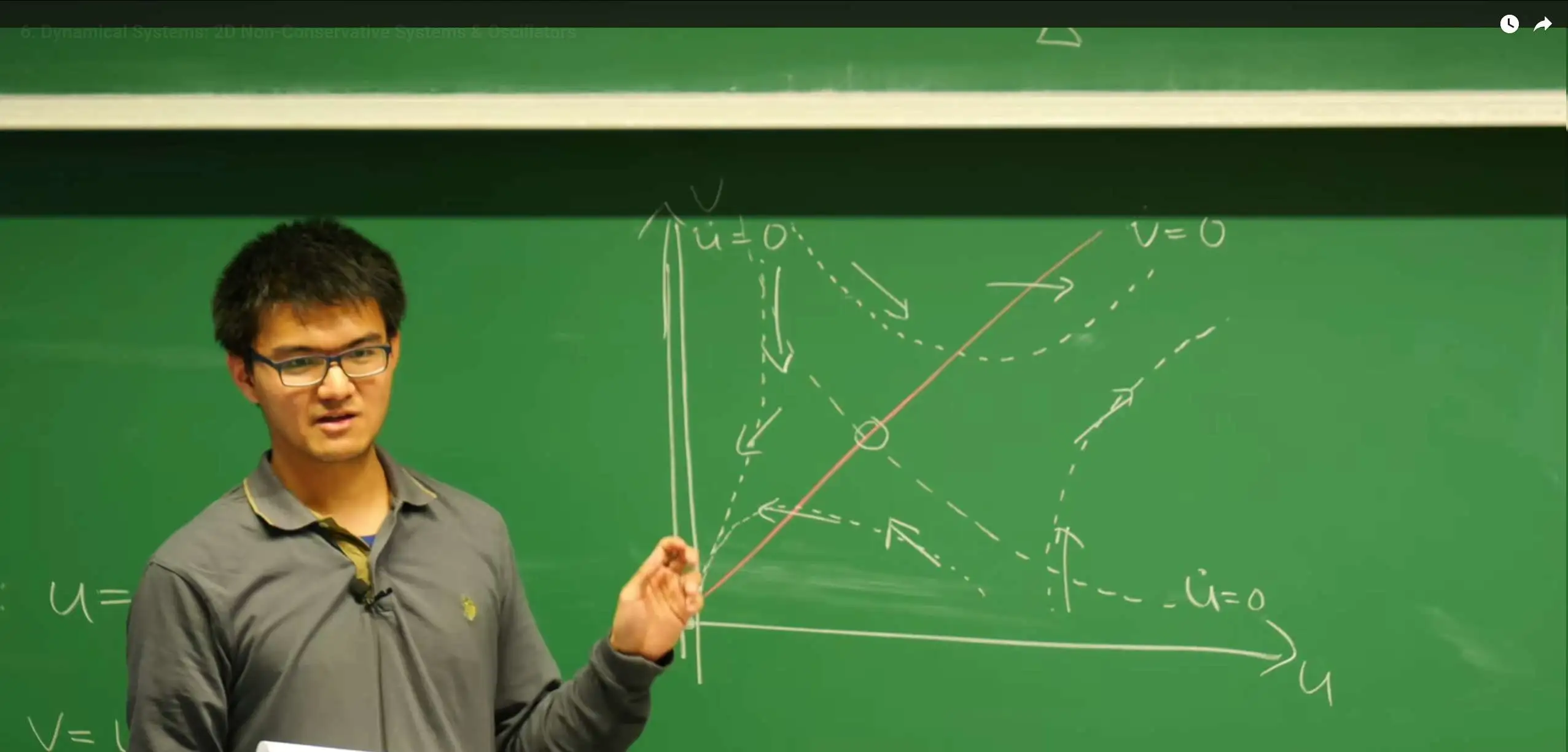 Therefore, although the system in Lecture 5 is formally two-dimensional, its dynamical essence is one-dimensional. Its evolution is strictly confined to a one-dimensional manifold (the conservation line). As a result, this system can only exhibit one-dimensional dynamical behavior (such as the saddle-node or transcritical bifurcations discussed in Lecture 3 and Lecture 4), and cannot produce any oscillatory behavior.