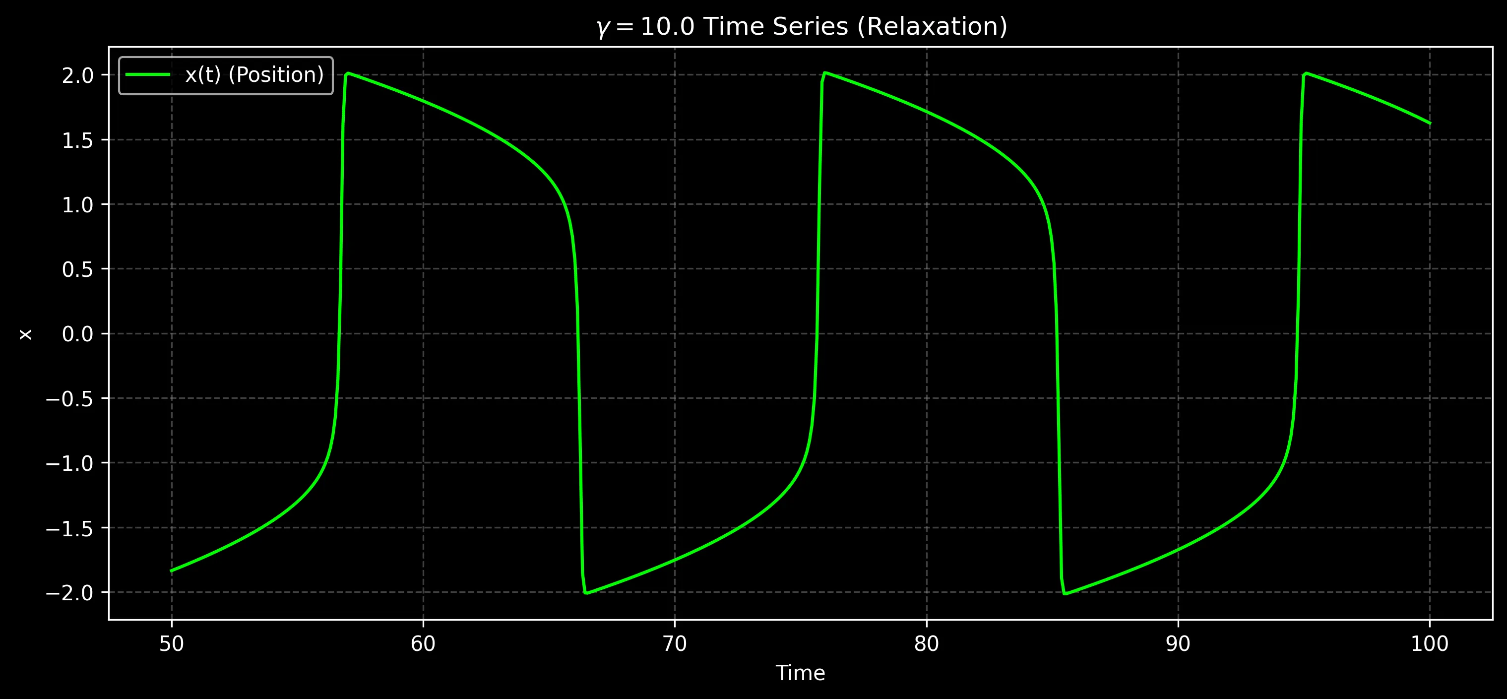 (Time series, \(\gamma = 10\)): This figure shows the waveform of \(x(t)\) over time. It is completely not a sine wave, but consists of a slow "charging" phase (\(x\) slowly rises) and a fast "discharge" phase (\(x\) rapidly falls)—this is the typical characteristic of a relaxation oscillator.