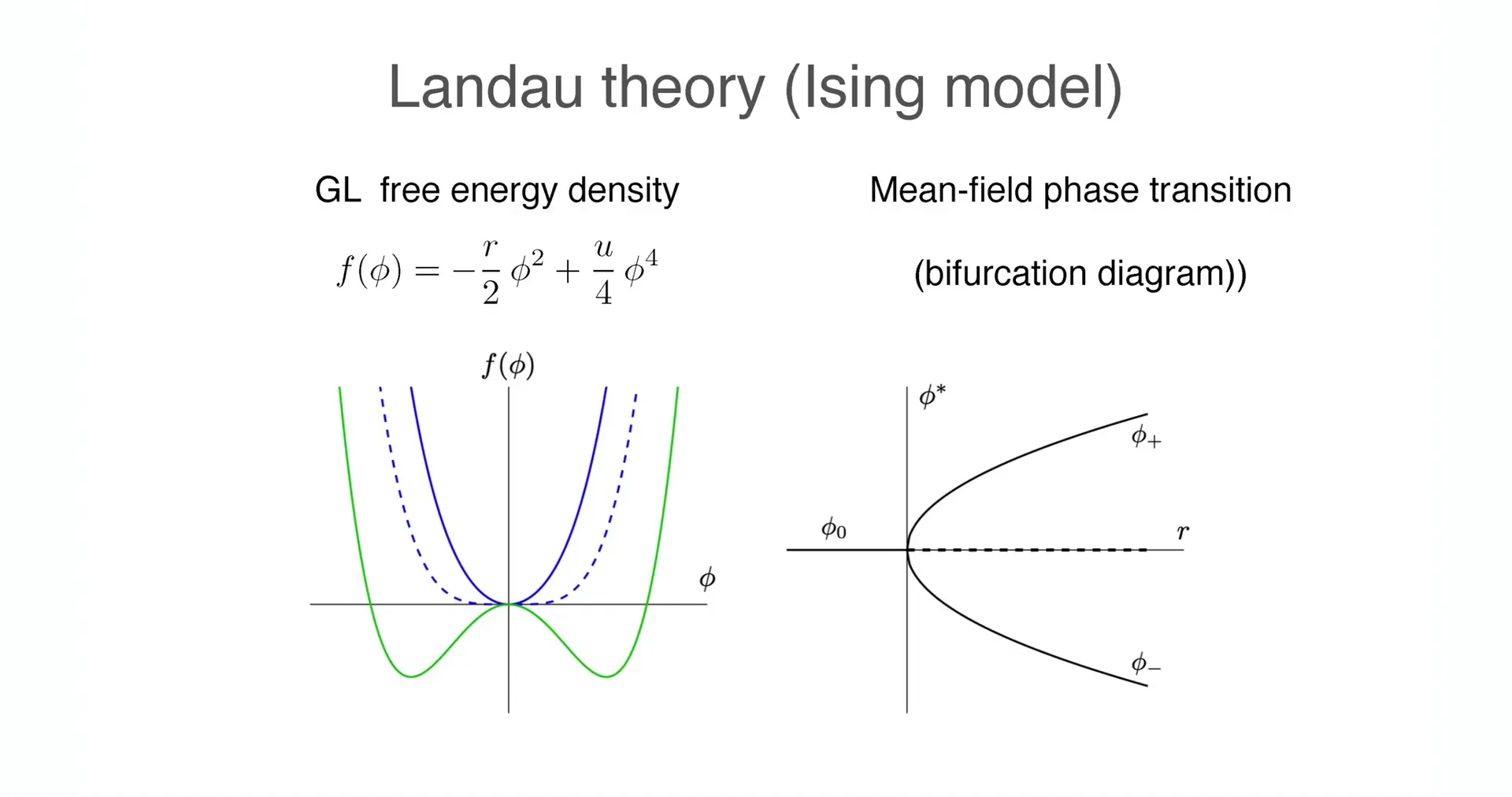 Critical behavior analysis: When the control parameter \(r\) gradually increases from negative values and crosses zero, the originally stable origin \(\phi=0\) suddenly loses stability (destabilizes), and two new stable branches \(\pm\sqrt{r/u}\) "bifurcate" on either side. The system must "choose" one of these two equivalent states—this is precisely the mathematical manifestation of Spontaneous Symmetry Breaking. This simple polynomial model not only successfully captures the essence of magnetic phase transitions but also universally describes a wide range of physical phenomena such as Euler column buckling instability and laser threshold generation.