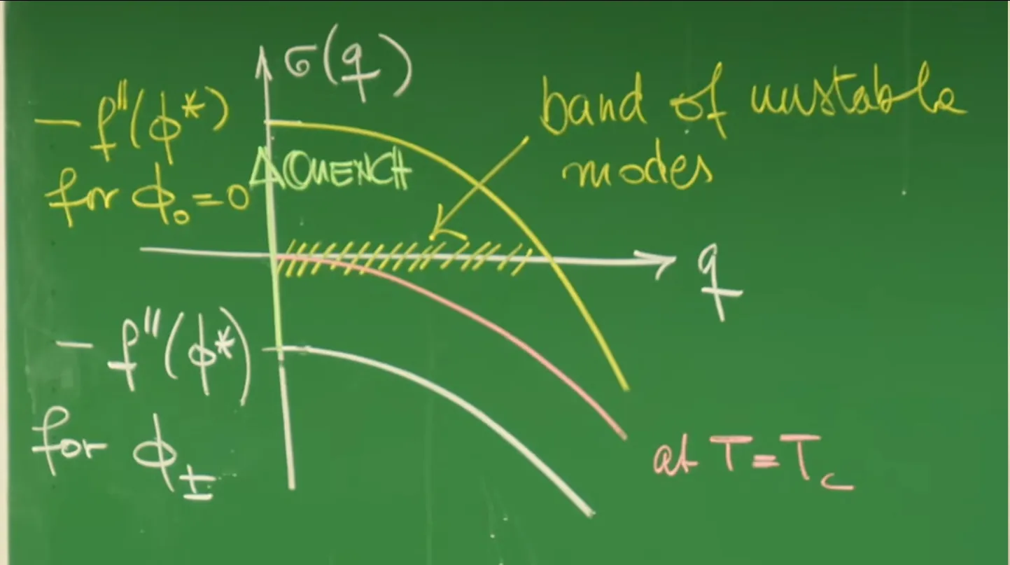 Phenomenon: The initially uniform green background rapidly becomes "mottled." Small fluctuations are rapidly amplified, with field values \(\phi\) locally differentiating toward \(\pm \sqrt{r/u}\) (red/blue).