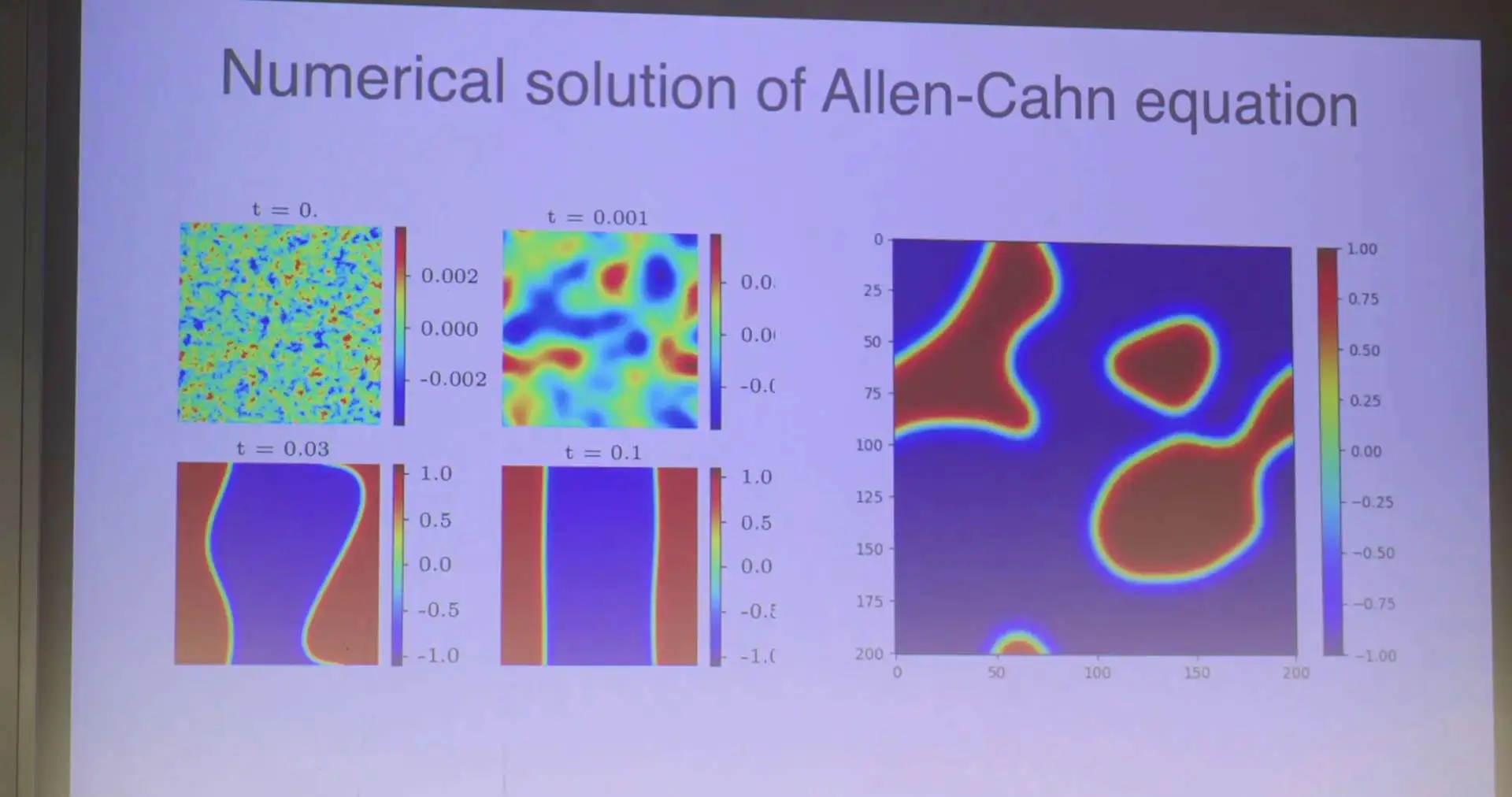 Time evolution sequence of Allen-Cahn equation numerical solution. Top left: initial random fluctuations; Top right: early patterns from Spinodal decomposition; Bottom left: interface formation and domain wall coarsening; Bottom right: late-stage merging of large-scale domains.